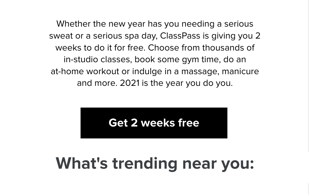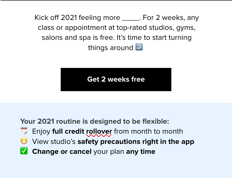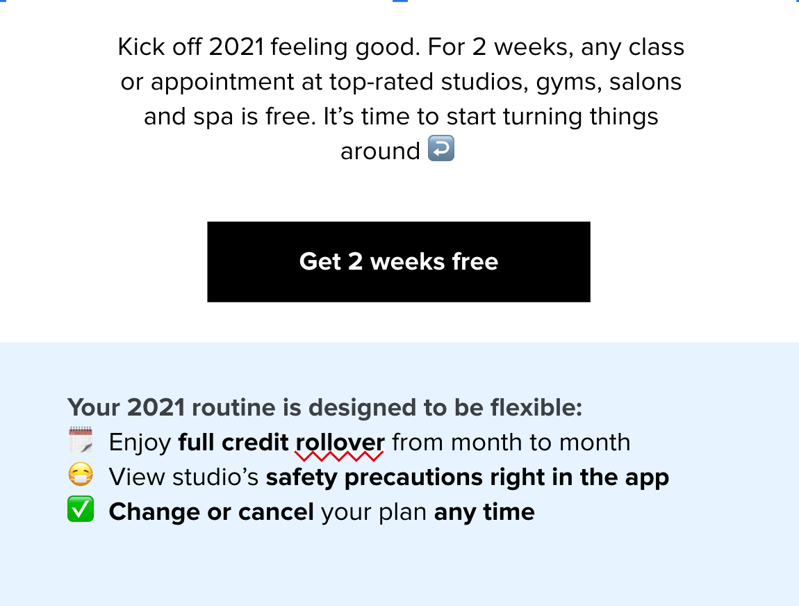 Gearing up for their busy season, ClassPass needed a hand with holiday promotions for the start of 2021. I worked on both web and in-app copy for the seasonal campaign, as well as a full, four-part email campaign with follow-up push-notifications to promote ClassPass’ two-week offer for new and churned audiences.