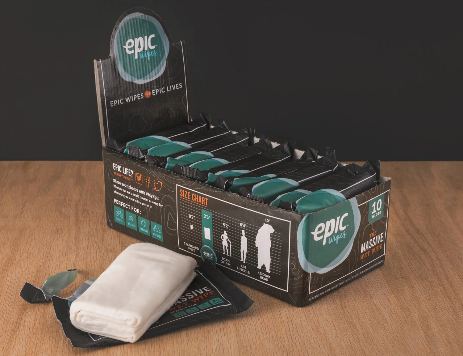 Designed for larger messes, Epic Wipes became a long-waited answer to disposable towels. Formulated by a military doctor and avid outdoorsman, the client developed his vision at Brands for the Brave, where I helped with light copy needs and branding strategy.